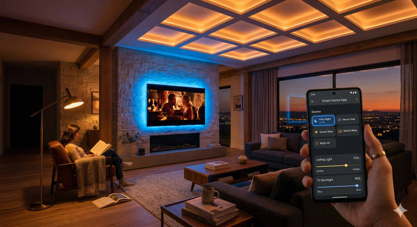 - Escena de Cine: Luces del salón al 10%, color cálido, y tiras LED traseras en azul suave.