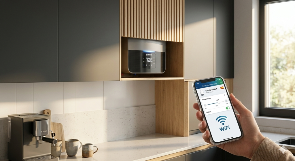 La domótica no es solo encender luces con la voz. Un calentador inteligente te permite programar sesiones de ducha desde el móvil, ver el consumo en tiempo real y, sobre todo, apagarlo automáticamente cuando te vas de viaje. Es la inversión que se paga sola en menos de un año.