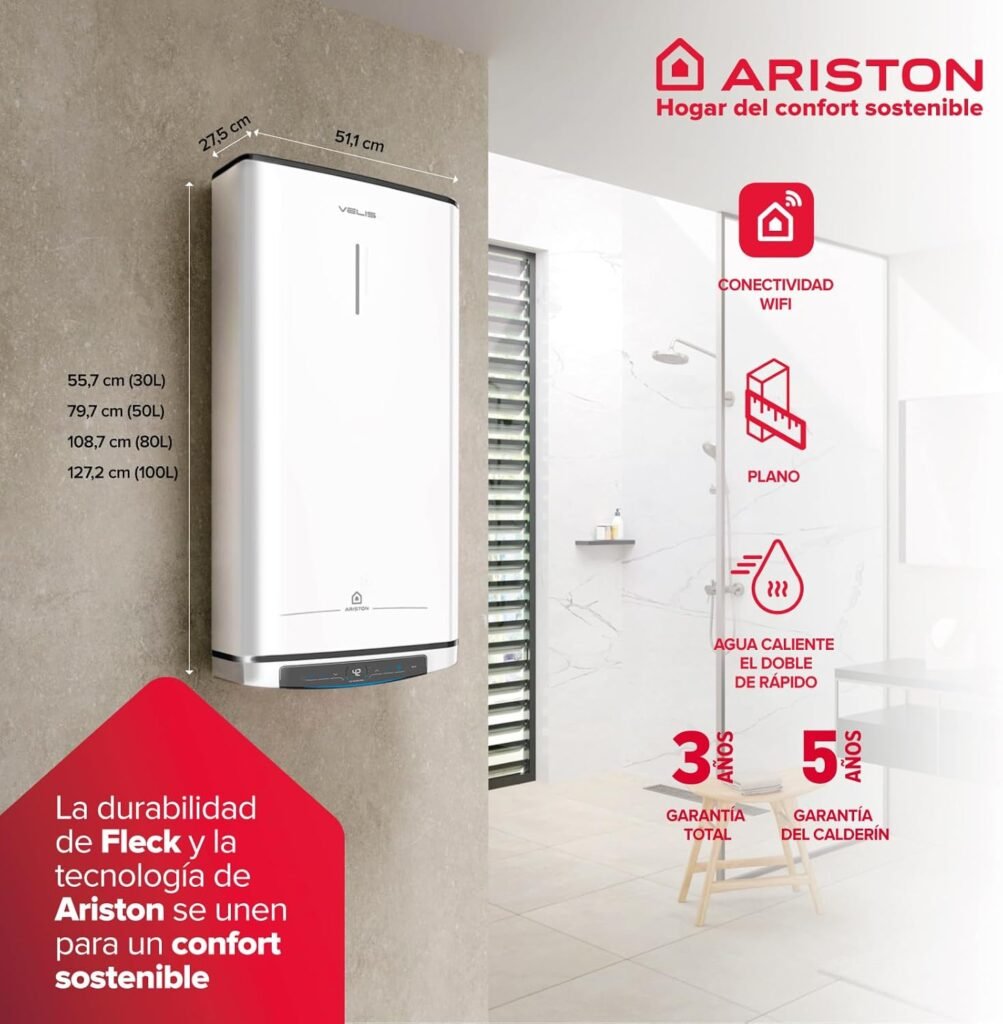 Ariston Velis Pro Wifi (ex.DUO 5 Fleck)- Termo Eléctrico 100L Litros Bajo Consumo Multiposición Calentador de Agua 127,2×27,5×51,1 para Instalación España Eficiencia B Rango(A+/F) Compatible con Alexa [Clase de eficiencia energética B]